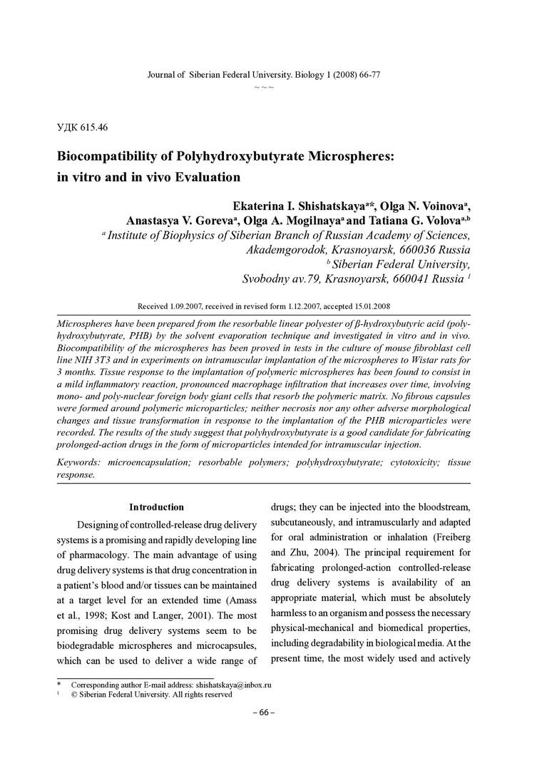 Библиографическое описание: Biocompatibility of Polyhydroxybutyrate Microspheres: in vitro and in vivo Evaluation / E. I. Shishatskaya, O. N. Voinova, A. V. Goreva [et al.]. - Текст : непосредственный // Журнал Сибирского федерального университета. Биология. - 2008. - Т. 1, № 1. - С. 66-77 : рис. - Библиогр.: с. 75-77. - ISSN 1997-1389.