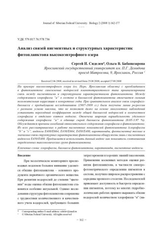 Анализ связей пигментных и структурных характеристик фитопланктона высокоэвтрофного озерастатья из журнала