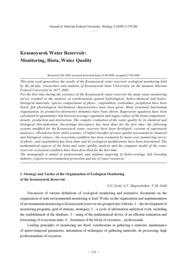 Библиографическое описание: Krasnoyarsk Water Reservoir: Monitoring, Biota, Water Quality / Z. G. Gold, A. V. Shaposhnikov, V. M. Gold [et al.]. - Текст : непосредственный // Журнал Сибирского федерального университета. Биология. - 2008. - Т. 1, № 2. - С. 178-186. - ISSN 1997-1389.