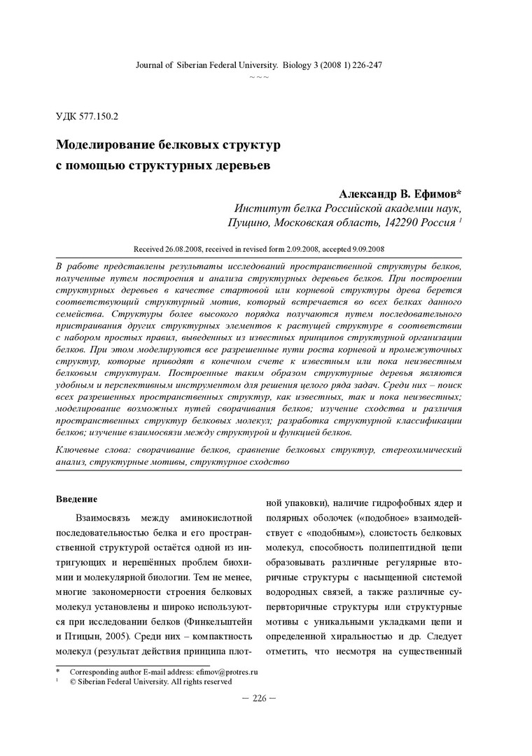 Библиографическое описание: Ефимов, Александр Васильевич. Моделирование белковых структур с помощью структурных деревьев = Modeling of Protein Structures Using Structural Trees / А. В. Ефимов. - Текст : непосредственный // Журнал Сибирского федерального университета. Биология. - 2008. - Т. 1, № 3. - С. 226-247 : рис. - Библиогр.: с. 245-246. - ISSN 1997-1389.