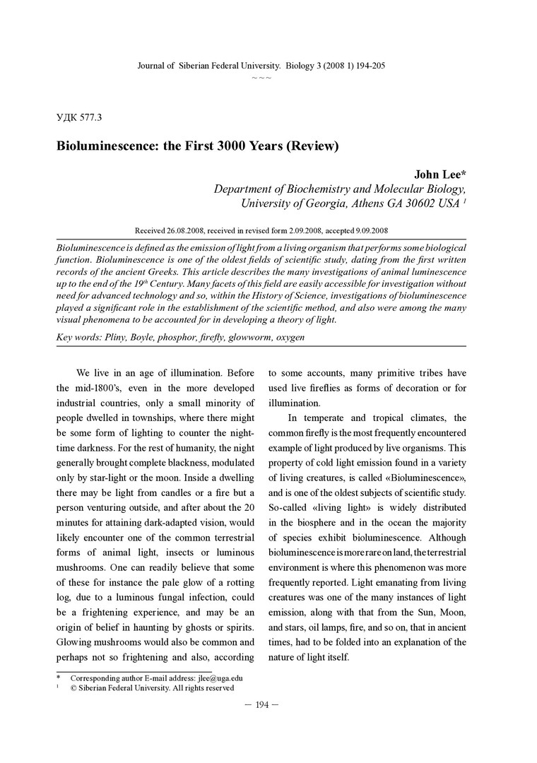 Библиографическое описание:Lee, John. Bioluminescence: the First 3000 Years (Review) / John Lee. - Текст : непосредственный // Журнал Сибирского федерального университета. Биология. - 2008. - Т. 1, № 3. - С. 194-205 : цв. ил. - Библиогр.: с. 205. - ISSN 1997-1389.
