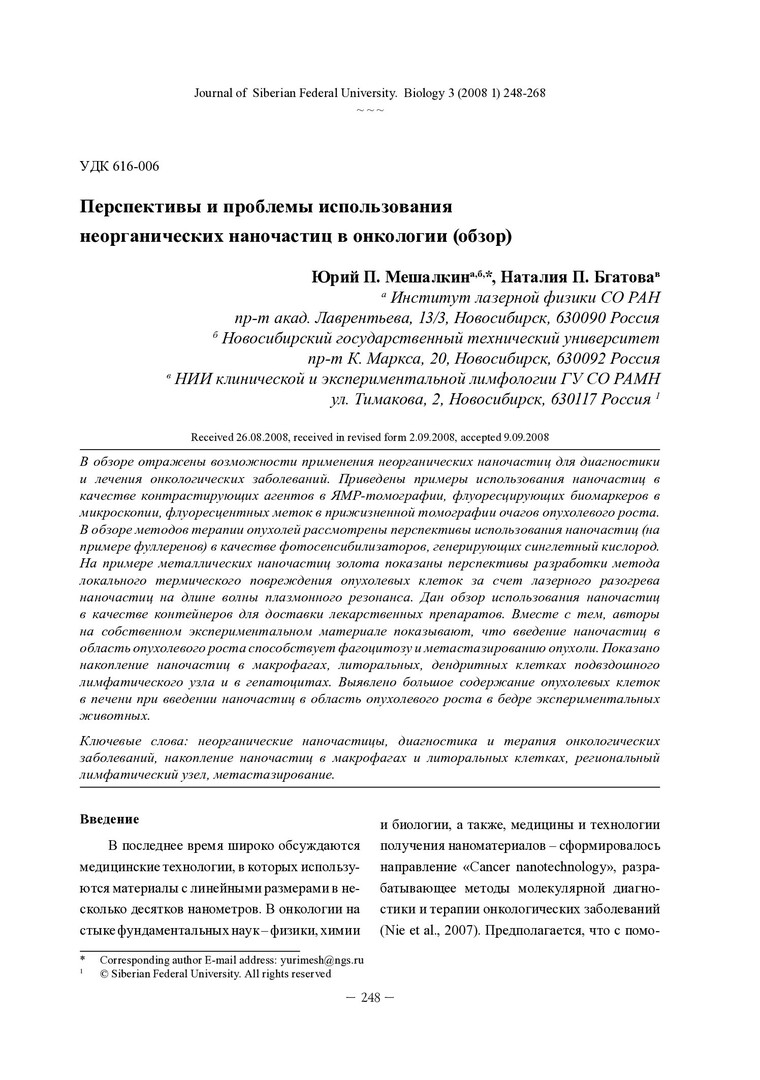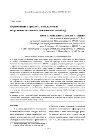 Библиографическое описание: Мешалкин, Юрий Петрович. Перспективы и проблемы использования неорганических наночастиц в онкологии (обзор) = Prospects and Problems of the Use of Inorganics Nanoparticles in Oncology (Review) / Ю. П. Мешалкин, Н. П. Бгатова. - Текст : непосредственный // Журнал Сибирского федерального университета. Биология. - 2008. - Т. 1, № 3. - С. 248-268 : рис., табл. - Библиогр.: с. 266-268. - ISSN 1997-1389.