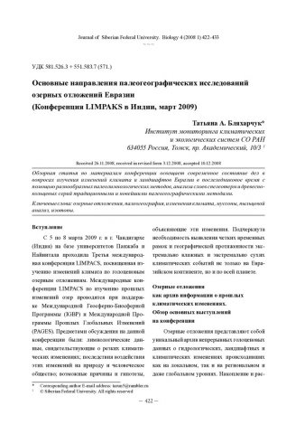 Библиографическое описание:Бляхарчук, Татьяна А... Основные направления палеогеографических исследований озерных отложений Евразии (Конференция LIMPAKS в Индии, март 2009) = The Third International Conference LIMPACX, devoted to Investigation of Holocene Lake’s Sediments, Chandigarh (India), 5-8 of March 2009 yr. / Т. А. Бляхарчук. - Текст : непосредственный // Журнал Сибирского федерального университета. Биология. - 2008. - Т. 1, № 4. - С. 422-433. - Библиогр.: с. 431-433. - ISSN 1997-1389.