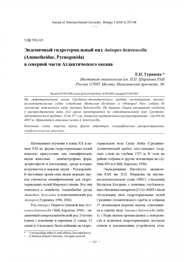 Библиографическое описание:Турпаева, Е. П. Эндемичный гидротермальный вид Anisopes heteroscella (Ammotheidae, Pycnogonida) в северной части Атлантического океана = Endemic Hydrothermal Species Anisopes heteroscella (Ammotheidae, Pycnogonida) in the Northern Part of the Atlantic Ocean / Е. П. Турпаева. - Текст : непосредственный // Журнал Сибирского федерального университета. Биология. - 2009. - Т. 2, № 3. - С. 337-341 : 2 табл. - Библиогр.: с. 340. - ISSN 1997-1389.