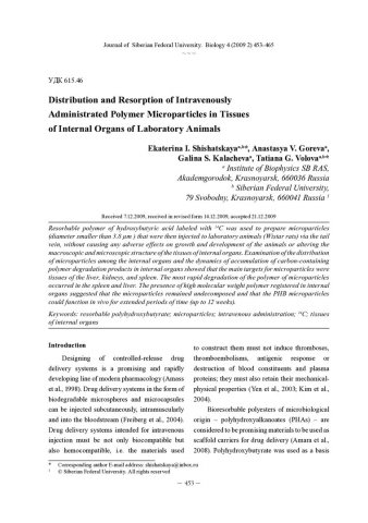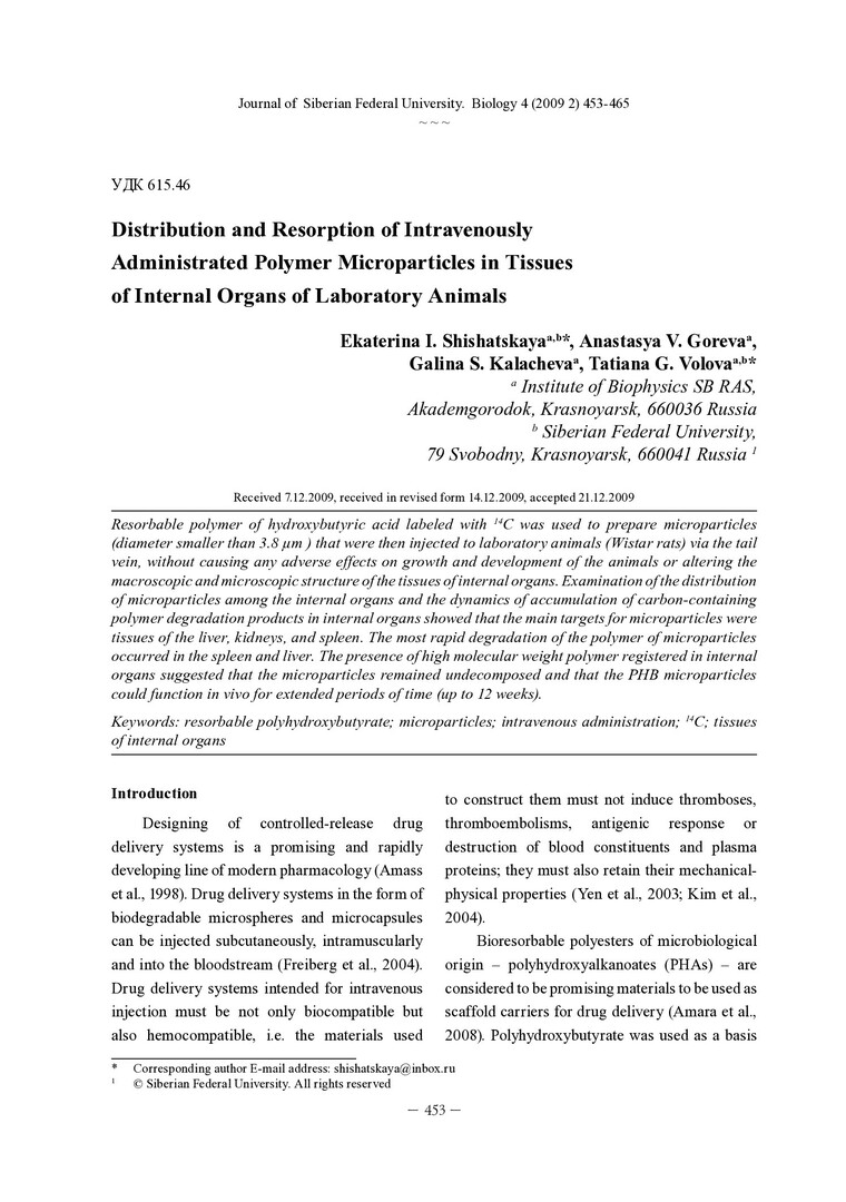 Библиографическое описание: Distribution and Resorption of Intravenously Administrated Polymer Microparticles in Tissues of Internal Organs of Laboratory Animals = Распределение и резорбция полимерных микрочастиц в тканях внутренних органов лабораторных животных при внутривенном введении / E. I. Shishatskaya, A. V. Goreva, G. S. Kalacheva, T. G. Volova. - Текст : непосредственный // Журнал Сибирского федерального университета. Биология. - 2009. - Т. 2, № 4. - С. 453-465 : 4 рис.; 2 табл. - Библиогр.: с. 462-464. - ISSN 1997-1389.