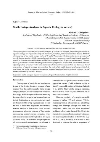 Библиографическое описание: Gladyshev, Michail I... Stable Isotope Analyses in Aquatic Ecology (a review) = Анализ стабильных изотопов в водной экологии (обзор) / M. I. Gladyshev. - Текст : непосредственный // Журнал Сибирского федерального университета. Биология. - 2009. - Т. 2, № 4. - С. 381-402 : рис. - Библиогр.: с. 398-401. - ISSN 1997-1389.