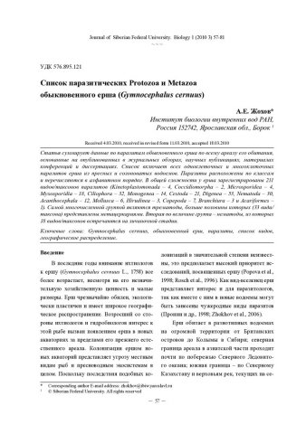 Библиографическое описание: Жохов, A. Е. Список паразитических Protozoa и Metazoa обыкновенного ерша (Gymnocephalus cernuus) = A checklist of the protozoan and metazoan parasites of ruff (Gymnocephalus cernuus) / A. Е. Жохов. - Текст : непосредственный // Журнал Сибирского федерального университета. Биология. - 2010. - Т. 3, № 1. - С. 57-81 : табл. - Библиогр.: с. 61-67. - ISSN 1997-1389.
