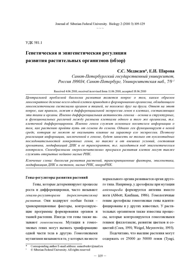 Библиографическое описание: Медведев, С. С. Генетическая и эпигенетическая регуляция развития растительных организмов (обзор) = Genetic and Epigenetic Regulation of Plant Development / С. С. Медведев, Е. И. Шарова. - Текст : непосредственный // Журнал Сибирского федерального университета. Биология. - 2010. - Т. 3, № 2. - С. 109-129 : 3 рис. - Библиогр.: с. 124-128. - ISSN 1997-1389.