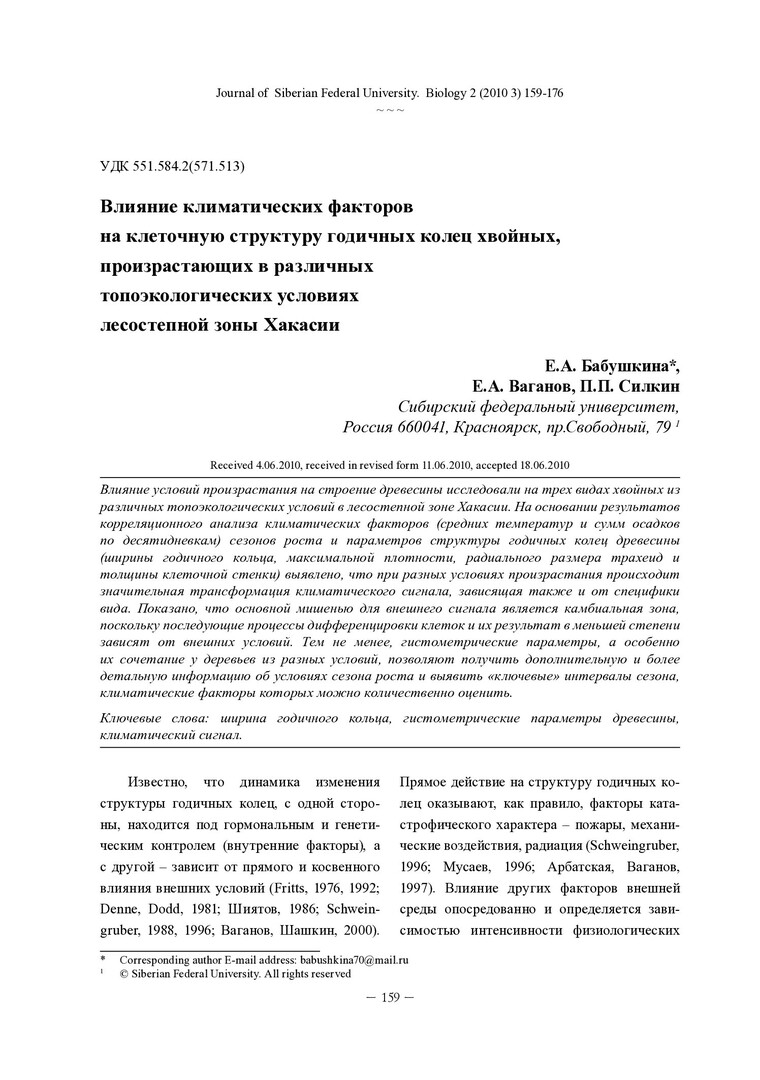 Библиографическое описание: Бабушкина, Е. А. Влияние климатических факторов на клеточную структуру годичных колец хвойных, произрастающих в различных топоэкологических условиях лесостепной зоны Хакасии = Influence of Climatic Factors on Tree-Ring Cell Structure of Conifers Growing in Different Topoecological Conditions in Forest-Steppe Zone of Khakassia / Е. А. Бабушкина, Е. А. Ваганов, П. П. Силкин. - Текст : непосредственный // Журнал Сибирского федерального университета. Биология. - 2010. - Т. 3, № 2. - С. 159-176 : 4 рис.; табл. - Библиогр.: с. 172-175. - ISSN 1997-1389.