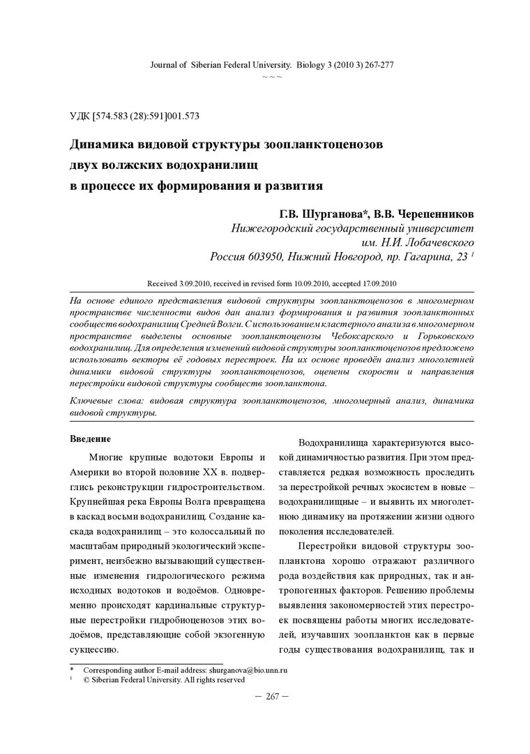 Аннотация:На основе единого представления видовой структуры зоопланктоценозов в многомерном пространстве численности видов дан анализ формирования и развития зоопланктонных сообществ водохранилищ Средней Волги. С использованием кластерного анализа в многомерном пространстве выделены основные зоопланктоценозы Чебоксарского и Горьковского водохранилищ. Для определения изменений видовой структуры зоопланктоценозов предложено использовать векторы её годовых перестроек. На их основе проведен анализ многолетней динамики видовой структуры зоопланктоценозов, оценены скорости и направления перестройки видовой структуры сообществ зоопланктона.