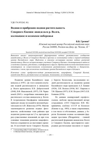 Библиографическое описание:Громов, В. В. Водная и прибрежно-водная растительность Северного Каспия: авандельта р. Волги, калмыцкое и казахское побережья = Higher-Plant Aquatic and Coastal Vegetation of the Northern Caspian: Volga Foredelta, Kalmyk and Kazakh Coasts / В. В. Громов. - Текст : непосредственный // Журнал Сибирского федерального университета. Биология. - 2010. - Т. 3, № 3. - С. 250-266 : 2 рис. - Библиогр.: с. 264-265. - ISSN 1997-1389.