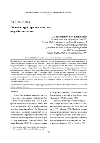 Библиографическое описание: Шевелева, Н. Г. Состав и структура зоопланктона озера Котокельское = Composition and Structure of Lake Kotokel / Н. Г. Шевелева, И. Ф. Кривенкова. - Текст : непосредственный // Журнал Сибирского федерального университета. Биология. - 2010. - Т. 3, № 3. - С. 278-291 : 3 рис.; 3 табл. - Библиогр.: с. 290-291. - ISSN 1997-1389.