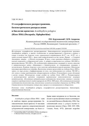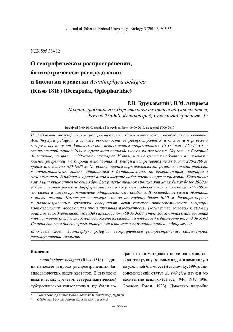 Библиографическое описание: Буруковский, Р. Н. О географическом распространении, батиметрическом распределении и биологии креветки Acanthephyra pelagica (Risso 1816) (Decapoda, Oplophoridae) = On the biology of Acanthephyra pelagica (Decapoda: Natantia: Oplophoridae) of the North Atlantic subtropical convergence zone / Р. Н. Буруковский, В. М. Андреева. - Текст : непосредственный // Журнал Сибирского федерального университета. Биология. - 2010. - Т. 3, № 3. - С. 303-321 : 8 рис. - Библиогр.: с. 317-320. - ISSN 1997-1389.