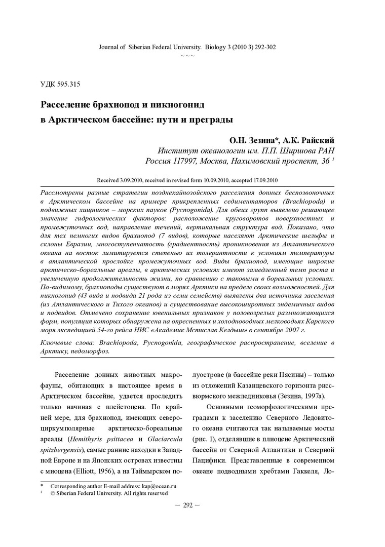 Библиографическое описание: Зезина, О. Н. Расселение брахиопод и пикногонид в Арктическом бассейне: пути и преграды = Expansion of Brachiopods and Pycnogonids in The Arctic Basin: Ways and Barriers / О. Н. Зезина, А. К. Райский. - Текст : непосредственный // Журнал Сибирского федерального университета. Биология. - 2010. - Т. 3, № 3. - С. 292-302 : 10 рис. - Библиогр.: с. 301-302. - ISSN 1997-1389.