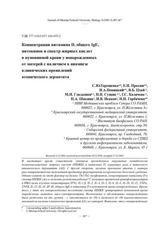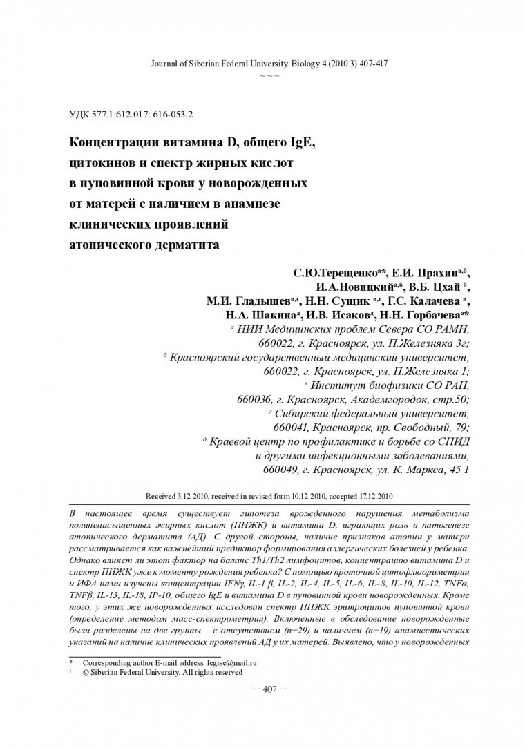 Библиографическое описание: Концентрации витамина D, общего IgE, цитокинов и спектр жирных кислот в пуповинной крови у новорожденных от матерей с наличием в анамнезе клинических проявлений атопического дерматита = Cord Blood Vitamin D, Total IgE, Cytokines Concentrations and Polyunsaturated Fatty Acids Spectrum in Newborns from Mothers with Atopic Dermatitis History / C. Ю. Терещенко, Е. И. Прахин, И. А. Новицкий [и др.]. - Текст : непосредственный // Журнал Сибирского федерального университета. Биология. - 2010. - Т. 3, № 4. - С. 407-417 : 3 рис. - Библиогр.: с. 415-416. - ISSN 1997-1389.