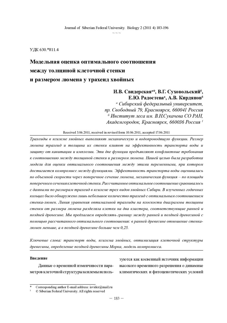 Библиографическое описание: Модельная оценка оптимального соотношения между толщиной клеточной стенки и размером люмена у трахеид хвойных = Model Estimation of Optimal Ratio between Cell Wall Thickness and Lumen Size for Tracheids of Conifers in Temperate Zone / И. В. Свидерская, В. Г. Суховольский, Е. Ю. Радостева, А. В. Кирдянов. - Текст : непосредственный // Журнал Сибирского федерального университета. Биология. - 2011. - Т. 4, № 2. - С. 183-196 : 5 рис.; табл. - Библиогр.: с. 193-196. - ISSN 1997-1389.