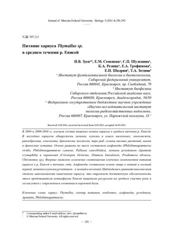 Питание хариуса Thymallus sp. в среднем течении р. Енисейстатья из журнала