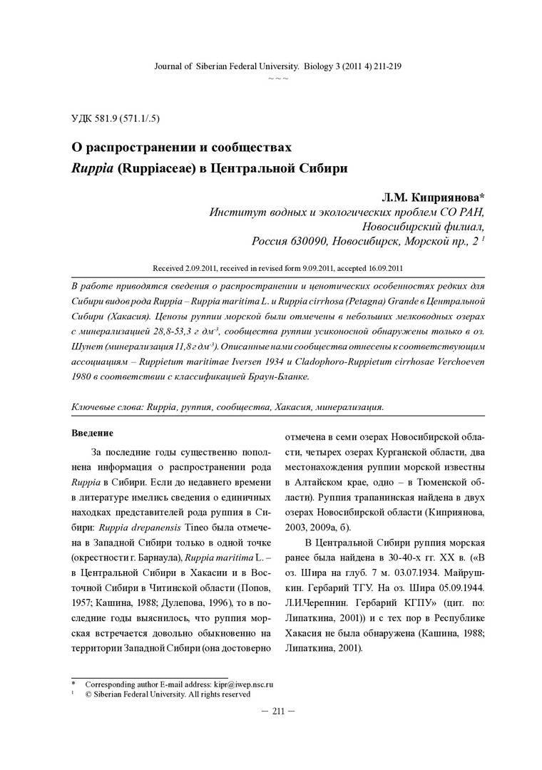 Библиографическое описание:Киприянова, Л. М. О распространении и сообществах Ruppia (Ruppiaceae) в Центральной Сибири = On Distribution and Communities of Ruppia (Ruppiaceae) in Central Siberia / Л. М. Киприянова. - Текст : непосредственный // Журнал Сибирского федерального университета. Биология. - 2011. - Т. 4, № 3. - С. 211-219 : рис.; табл. - Библиогр.: с. 218-219. - ISSN 1997-1389.