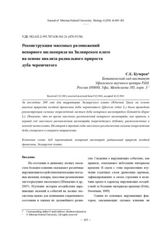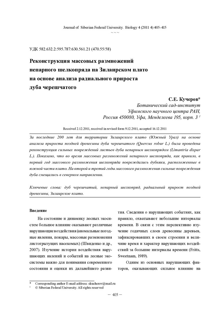 Аннотация:За последние 200 лет для территории Зилаирского плато (Южный Урал) на основе анализа прироста поздней древесины дуба черешчатого (Quercus robur L.) была проведена реконструкция сильных повреждений листьев дуба непарным шелкопрядом (Limantria dispar L.). Показано, что во время массовых размножений непарного шелкопряда, как правило, в первый год массового размножения шелкопряда повреждались дубняки, расположенные в южной части плато. На второй и третий годы массового размножения сильные повреждения дуба смещались в северном направлении.