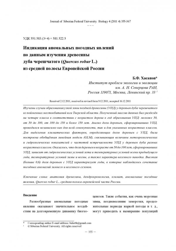 Библиографическое описание: Хасанов, Б. Ф. Индикация аномальных погодных явлений по данным изучения древесины дуба черешчатого (Quercus robur L.) из средней полосы Европейской России = Indication of Extreme Weather Events on the Wood Anatomy of Oak Trees (Quercus Robur L.) From the Central European Russia / Б. Ф. Хасанов. - Текст : непосредственный // Журнал Сибирского федерального университета. Биология. - 2011. - Т. 4, № 4. - С. 355-367 : 3 рис.; табл. - Библиогр.: с. 365-367. - ISSN 1997-1389.