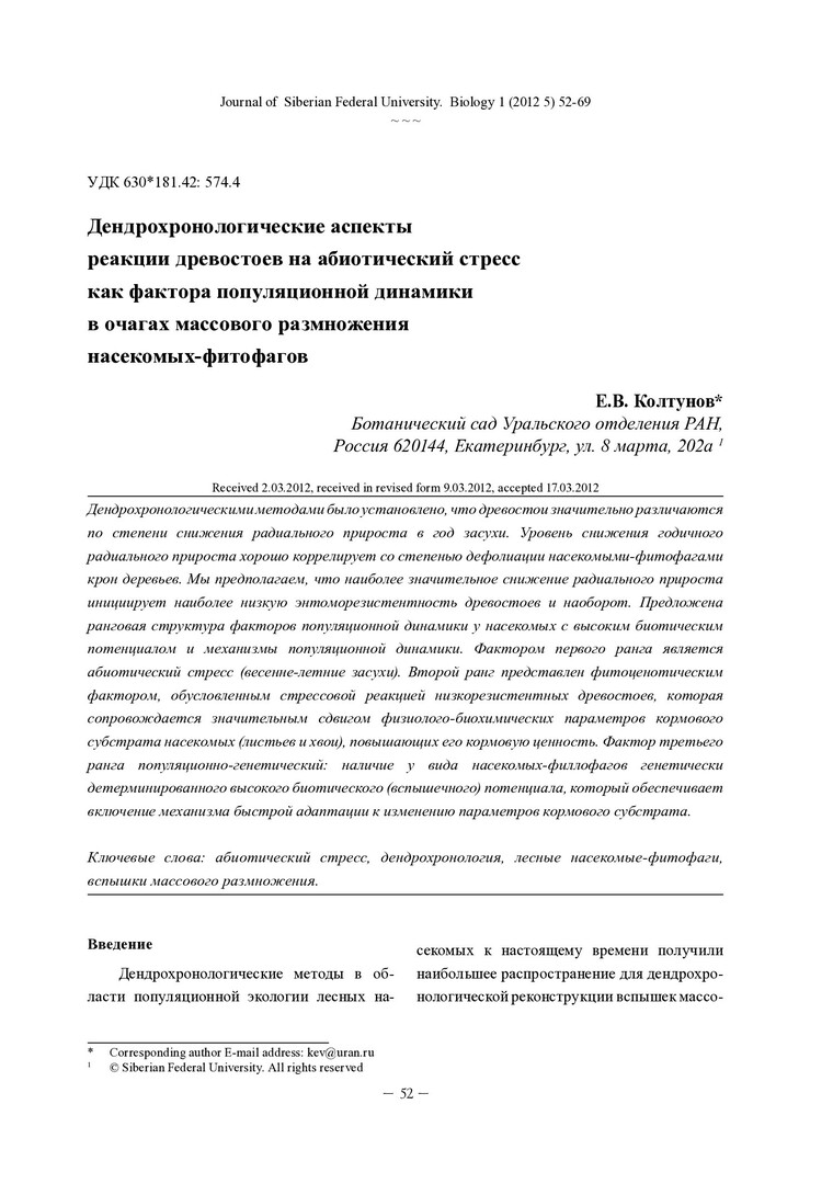 Библиографическое описание:Колтунов, Евгений. Дендрологические аспекты реакции древостоев на абиотический стресс как фактора популяционной динамики в очагах массового размножения насекомых-фитофагов = Dendrochronological Aspects of Stands Reaction on the Abiotic Stress as the Populations Dynamics Factor at the Insects-Phytophagous Outbreaks / Е. В. Колтунов. - Текст : непосредственный // Журнал Сибирского федерального университета. Биология. - 2012. - Т. 5, № 1. - С. 52-69 : табл., ил. - Библиогр.: с. 66-68. - ISSN 1997-1389.