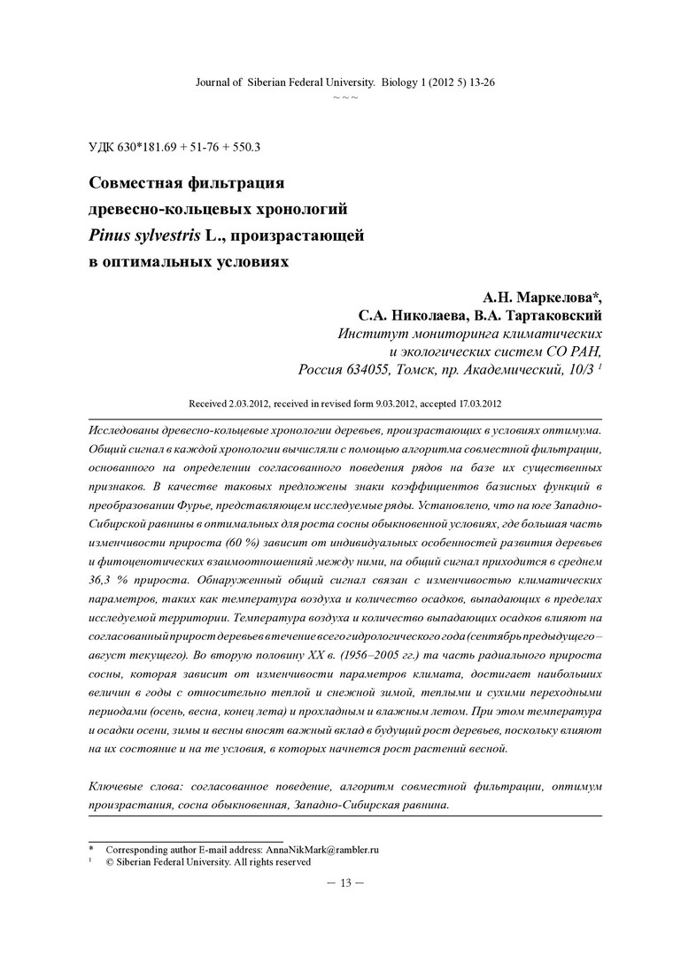 Аннотация:Исследованы древесно-кольцевые хронологии деревьев, произрастающих в условиях оптимума. Общий сигнал в каждой хронологии вычисляли с помощью алгоритма совместной фильтрации, основанного на определении согласованного поведения рядов на базе их существенных признаков. В качестве таковых предложены знаки коэффициентов базисных функций в преобразовании Фурье, представляющем исследуемые ряды.