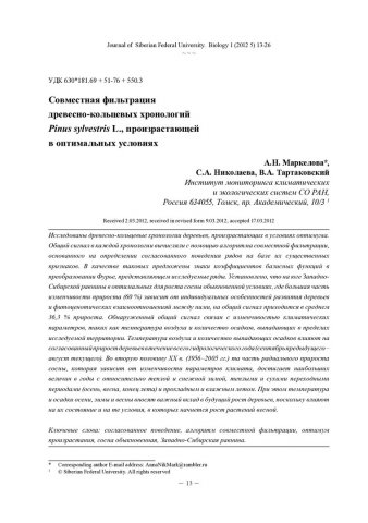 Библиографическое описание:Маркелова, Анна. Совместная фильтрация древесно-кольцевых хронологий Pinus sylvestris L., произрастающей в оптимальных условиях = Co-Filtering of the Tree-Ring Series Pinus Sylvestris L. from Sites with Optimal Growth Conditions / А. Н. Маркелова, С. А. Николаева, В. А. Тартаковский. - Текст : непосредственный // Журнал Сибирского федерального университета. Биология. - 2012. - Т. 5, № 1. - С. 13-26 : ил., табл. - Библиогр.: с. 25-26. - ISSN 1997-1389.