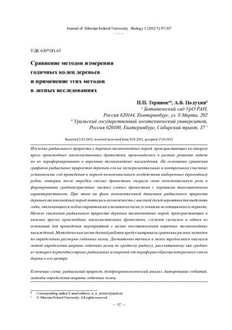 Библиографическое описание:Теринов, Николай. Сравнение методов измерения годичных колец деревьев и применение этих методов в лесных исследованиях = Comparison of Methods of Measurement of Annual Rings of Trees and Their Application in Forest Researches / Н. Н. Теринов, А. В. Полухин. - Текст : непосредственный // Журнал Сибирского федерального университета. Биология. - 2012. - Т. 5, № 1. - С. 97-107 : ил., табл. - Библиогр.: с. 106. - ISSN 1997-1389.