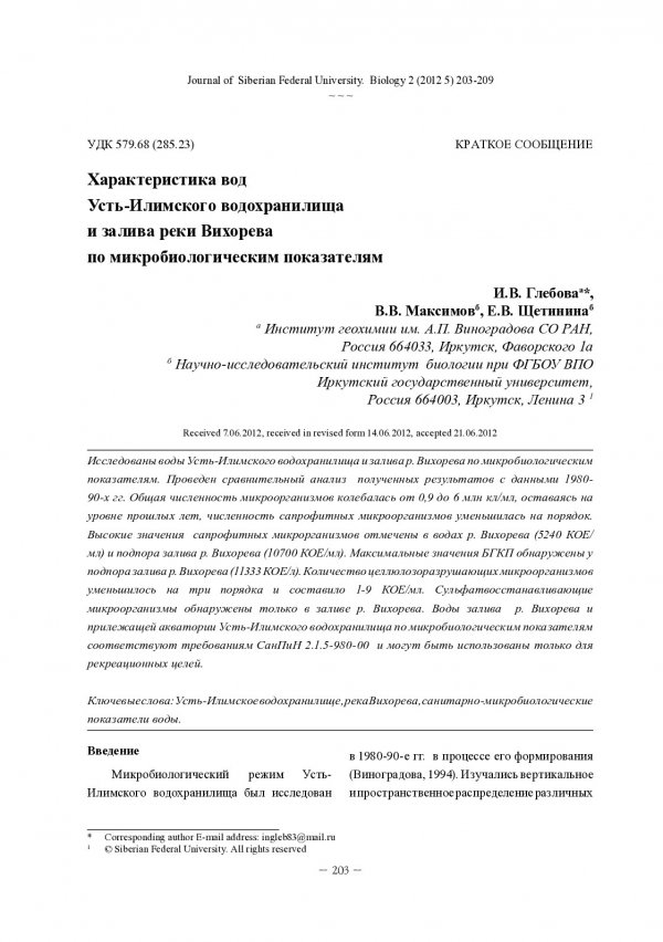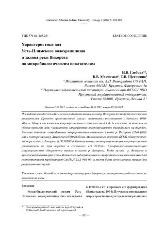 Библиографическое описание: Глебова, Инесса. Характеристика вод Усть-Илимского водохранилища и залива реки Вихорева по микробиологическим показателям = Characteristic of Water Ust-Ilim Reservoir and Bay of the River Vikhoreva by Microbiological Indicators / И. В. Глебова, В. В. Максимов, Е. В. Щетинина. - Текст : непосредственный // Журнал Сибирского федерального университета. Биология. - 2012. - Т. 5, № 2. - С. 203-209 : ил., табл. - Библиогр.: с. 208-209. - ISSN 1997-1389.