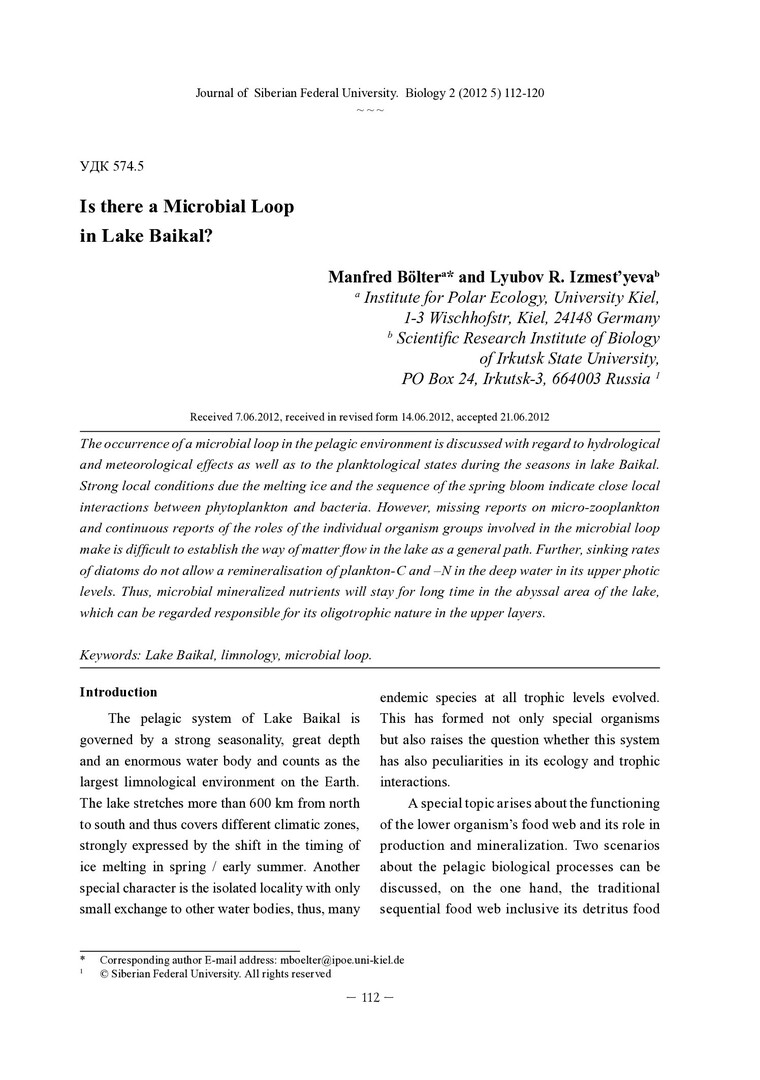 Библиографическое описание: Bolter, Manfred. Is there a Microbial Loop in Lake Baikal? = Существует ли микробная петля в озере Байкал? / M. Bolter, L. R. Izmest`yeva. - Текст : непосредственный // Журнал Сибирского федерального университета. Биология. - 2012. - Т. 5, № 2. - С. 112-120. - Библиогр.: с. 117-119. - ISSN 1997-1389.