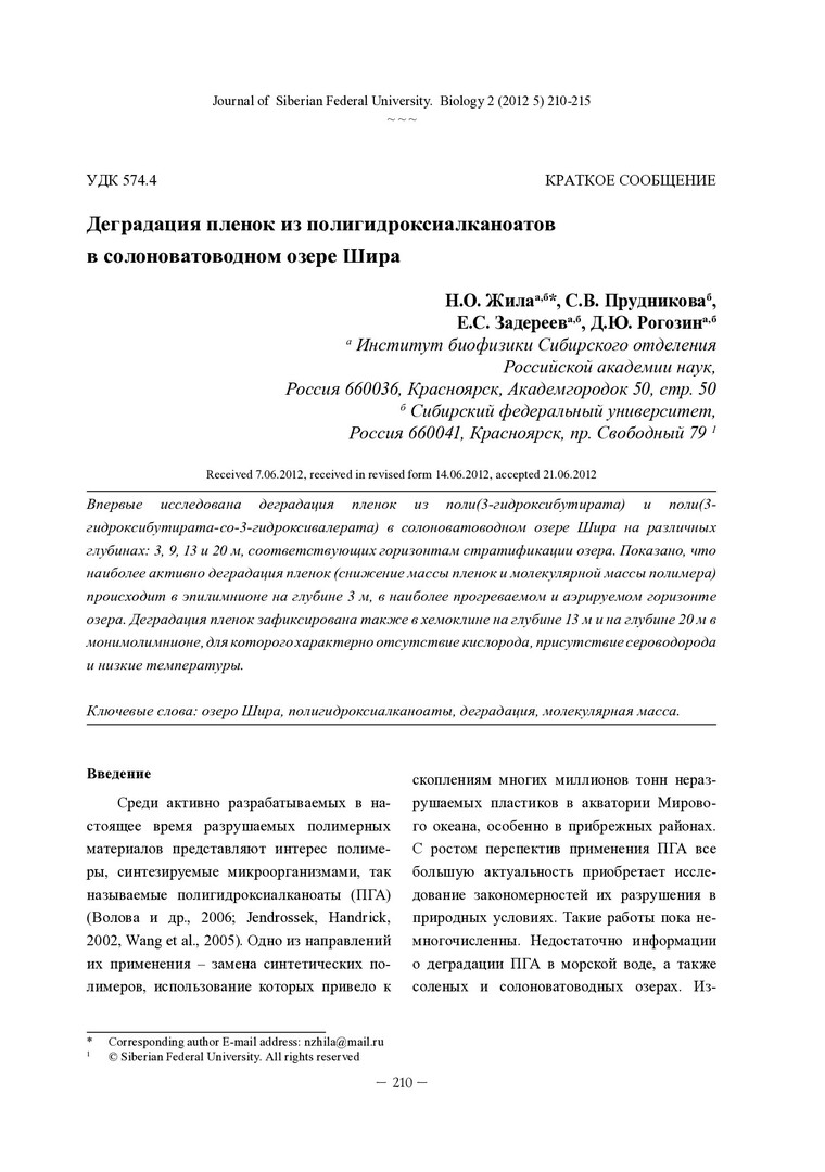 Аннотация:Впервые исследована деградация пленок из поли (3-гидроксибутирата) и поли (3- гидроксибутирата-со-3-гидроксивалерата) в солоноватоводном озере Шира на различных глубинах: 3, 9, 13 и 20 м, соответствующих горизонтам стратификации озера. Показано, что наиболее активно деградация пленок (снижение массы пленок и молекулярной массы полимера) происходит в эпилимнионе на глубине 3 м, в наиболее прогреваемом и аэрируемом горизонте озера. Деградация пленок зафиксирована также в хемоклине на глубине 13 м и на глубине 20 м в монимолимнионе, для которого характерно отсутствие кислорода, присутствие сероводорода и низкие температуры.