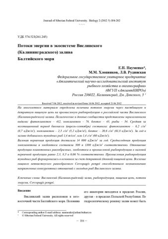 Библиографическое описание: Науменко, Елена. Потоки энергии в экосистеме Вислинского (Калининградского) залива Балтийского моря = Energy Flows in the Vistula Lagoon of the Baltic Sea / Е. Н. Науменко, М. М. Хлопников, Л. В. Рудинская. - Текст : непосредственный // Журнал Сибирского федерального университета. Биология. - 2012. - Т. 5, № 2. - С. 184-202 : ил., табл. - Библиогр.: с. 198-202. - ISSN 1997-1389.
