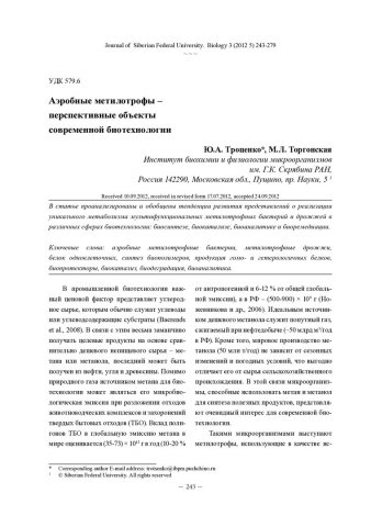 Библиографическое описание:Троценко, Юрий. Аэробные метилотрофы - перспективные объекты современной биотехнологии = Aerobic Methylotrophs – Promising Objects of Modern Biotechnology / Ю. А. Троценко, М. Л. Торгонская. - Текст : непосредственный // Журнал Сибирского федерального университета. Биология. - 2012. - Т. 5, № 3. - С. 243-279 : табл. - Библиогр.: с. 273-279. - ISSN 1997-1389.