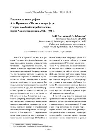 Библиографическое описание:Гладышев, М. И. Рецензия на монографию А.А. Протасова «Жизнь в гидросфере. Очерки по общей гидробиологии». Киев: Академпериодика, 2011. – 704 с. / М. И. Гладышев, О. П. Дубовская. - Текст : непосредственный // Журнал Сибирского федерального университета. Биология. - 2013. - Т. 6, № 1. - С. 108-111. - Рец. на кн.: Протасов А. А. Жизнь в гидросфере. Очерки по общей гидробиологии. - Киев: Академпериодика, 2011. – 704 с. - ISSN 1997-1389.