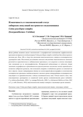 Библиографическое описание: Богданов, Бахтияр. Изменчивость и таксономический статус сибирских популяций пестроногого подкаменщика Cottus poecilopus complex (Scorpaeniformes: Cottidae) = Variability and Taxonomic Status of Siberian Population of Alpine Sculpin Cottus Poecilopus Complex (Scorpaeniformes: Cottidae) / Б. Э Богданов, Т. В. Смирнова, И. Б. Книжин. - Текст : непосредственный // Журнал Сибирского федерального университета. Биология. - 2013. - Т. 6, № 1. - С. 18-31 : ил., табл. - Библиогр.: с. 28-30 (29 назв.). - ISSN 1997-1389.