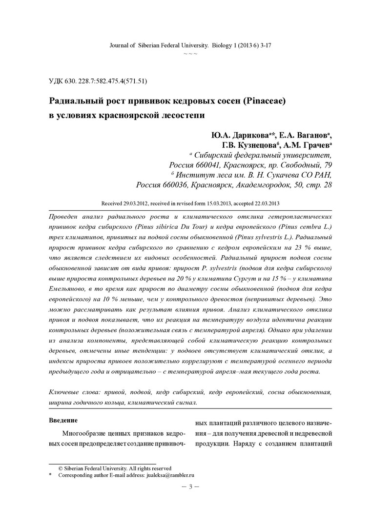 Библиографическое описание: Радиальный рост прививок кедровых сосен (Pinaceae) в условиях красноярской лесостепи = Radial Growth of Siberian Pine Heterografts (Pinaceae) in Krasnoyarsk Forest-Steppe / Ю.А. Дарикова [и др.]. - Текст : непосредственный // Журнал Сибирского федерального университета. Биология. - 2013. - Т. 6, № 1. - С. 3-17 : табл. - Библиогр.: с. 15-16 (23 назв.). - ISSN 1997-1389.