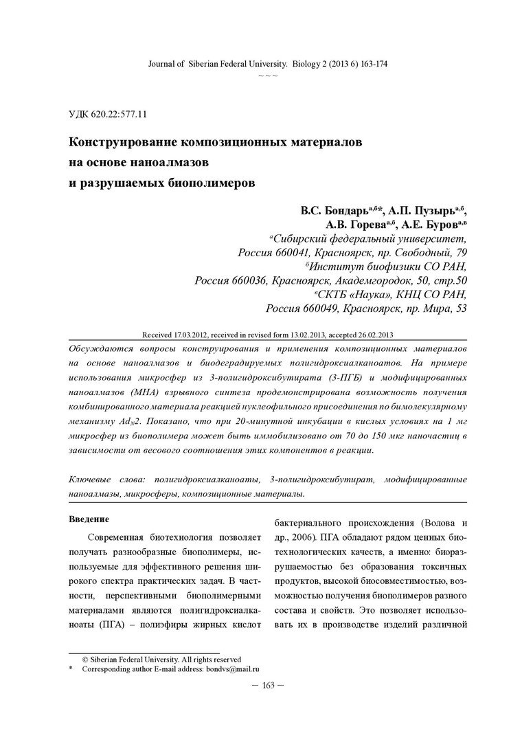 Библиографическое описание:Конструирование композиционных материалов на основе наноалмазов и разрушаемых биополимеров = The Engineering of Composite Materials Based on Nanodiamonds and Degradable Biopolymers / В. С. Бондарь [и др.]. - Текст : непосредственный // Журнал Сибирского федерального университета. Биология. - 2013. - Т. 6, № 2. - С. 163-174 : ил. - Библиогр.: с. 171-174 (35 назв.). - ISSN 1997-1389.