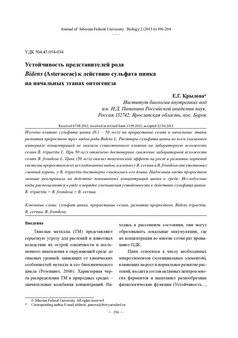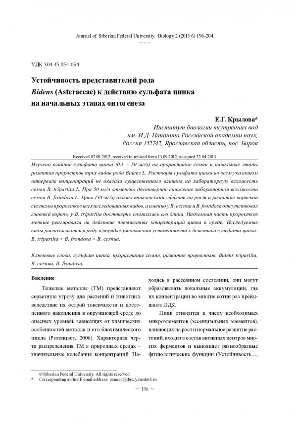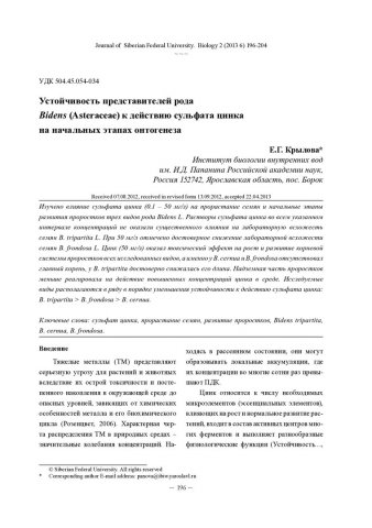 Библиографическое описание:Крылова, Е. Г. Устойчивость представителей рода Bidens (Asteraceae) к действию сульфата цинка на начальных этапах онтогенеза = Stability of the Genus Bidens (Asteraceae) to Action of Zinc Sulfate in the Early Stages of Ontogeny / Е. Г. Крылова. - Текст : непосредственный // Журнал Сибирского федерального университета. Биология. - 2013. - Т. 6, № 2. - С. 196-204 : ил., табл. - Библиогр.: с. 202-203 (20 назв.). - ISSN 1997-1389.
