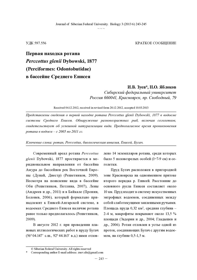 Библиографическое описание:Зуев, И. В. Первая находка ротана Perccottus glenii Dybowski, 1877 (Perciformes: Odontobutidae) в бассейне Среднего Енисея = The First Finding of Amur Sleeper Perccottus Glenii Dybowski, 1877 (Perciformes: Odontobutidae) in the Middle Yenisey Basin / И. В. Зуев, Н. О. Яблоков. - Текст : непосредственный // Журнал Сибирского федерального университета. Биология. - 2013. - Т. 6, № 3. - С. 243-245. - Библиогр.: с. 44-45 (12назв.). - ISSN 1997-1389.