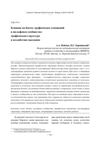 Библиографическое описание: Нейман, А. А. Влияние на бентос трофических отношений в шельфовом сообществе: трофическая структура и воздействие выедания = Influence of Trophic Relations in the Shelf Communities on Benthos: Trophic Structure and the Effects of Grazing Pressure / А. А. Нейман, М. Г. Карпинский. - Текст : непосредственный // Журнал Сибирского федерального университета. Биология. - 2013. - Т. 6, № 4. - С. 368-387 : ил. - Библиогр.: с. 382-386 (81 назв.). - ISSN 1997-1389.