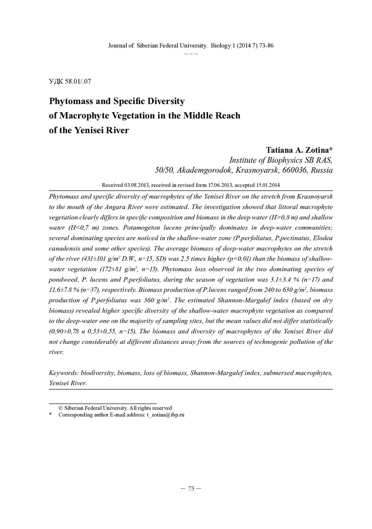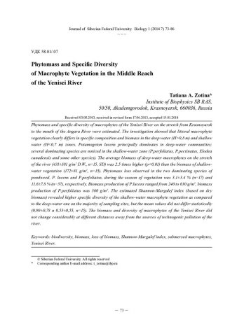 Библиографическое описание:Зотина, Т. А. Фитомасса и видовое разнообразие макрофитной растительности в среднем течении р. Енисей = Phytomass and Specific Diversity of Macrophyte Vegetation in the Middle Reach of the Yenisei River / Т. А. Зотина. - Текст : непосредственный // Журнал Сибирского федерального университета. Биология. - 2014. - Т. 7, № 1. - С. 73-86. - Библиогр.: с. 84-86 (33 назв.). - ISSN 1997-1389.