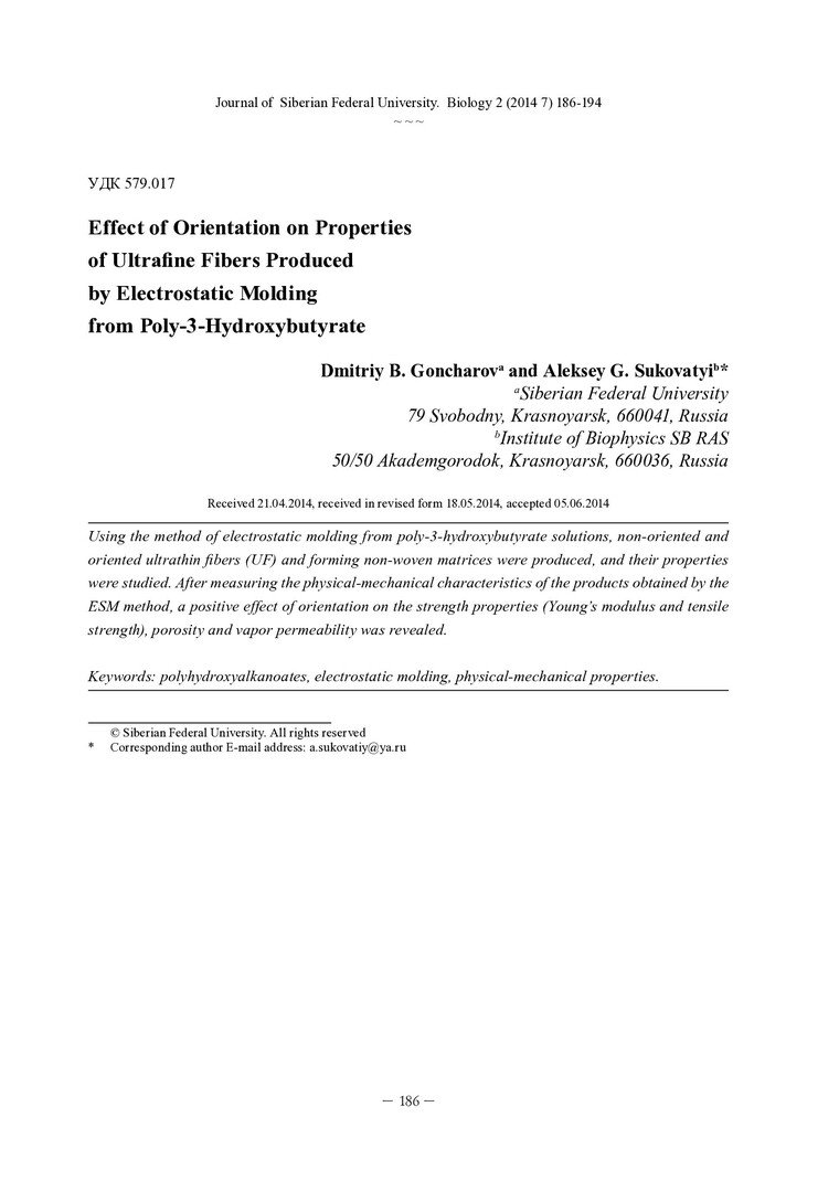 Библиографическое описание:Гончаров, Д. Б. Влияние ориентированности на свойства ультратонких волокон, полученных методом электростатического формования из поли-3-гидроксибутирата = Effect of Orientation on Properties of Ultrafine Fibers Produced by Electrostatic Molding from Poly-3-Hydroxybutyrate / Д. Б. Гончаров, А. Г. Суковатый. - Текст : непосредственный // Журнал Сибирского федерального университета. Биология. - 2014. - Т. 7, № 2. - С. 186-194 : ил., табл. - Библиогр.: с. 194 (18 назв.). - ISSN 1997-1389.