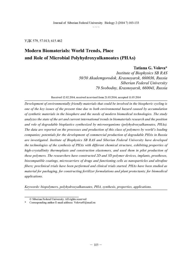 Библиографическое описание:Волова, Т. Г. Современные биоматериалы: мировые тренды, место и роль микробных полигидроксиалканоатов = Modern Biomaterials: World Trends, Place and Role of Microbial Polyhydroxyalkanoates (PHAs) / Т. Г. Волова. - Текст : непосредственный // Журнал Сибирского федерального университета. Биология. - 2014. - Т. 7, № 2. - С. 103-133 : табл. - Библиогр.: с. 130-133 (44 назв.). - ISSN 1997-1389.