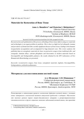 Библиографическое описание:Шумилова, А. А. Материалы для восстановления костной ткани = Materials for Restoration of Bone Tissue / А. А. Шумилова, Е. И. Шишацкая. - Текст : непосредственный // Журнал Сибирского федерального университета. Биология. - 2014. - Т. 7, № 2. - С. 209-221 : ил. - Библиогр.: с. 218-221 (43 назв.). - ISSN 1997-1389.