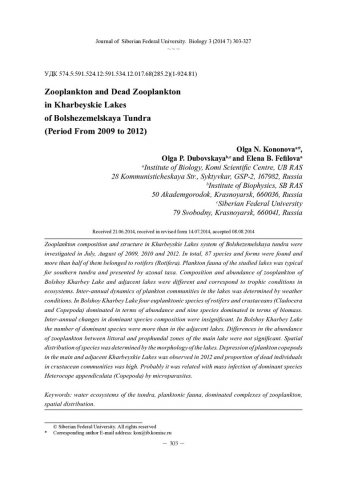 Библиографическое описание: Кононова, О. Н. Зоо- и некрозоопланктон Харбейских озер большеземельской тундры (по исследованиям 2009-2012 годов) = Zooplankton and Dead Zooplankton in Kharbeyskie Lakes of Bolshezemelskaya Tundra (Period From 2009 to 2012) / О. Н. Кононова, О. П. Дубовская, Е. Б. Фефилова. - Текст : непосредственный // Журнал Сибирского федерального университета. Биология. - 2014. - Т. 7, № 3. - С. 303-327 : табл., ил. - Библиогр.: с. 324-327 (50 назв.). - ISSN 1997-1389.