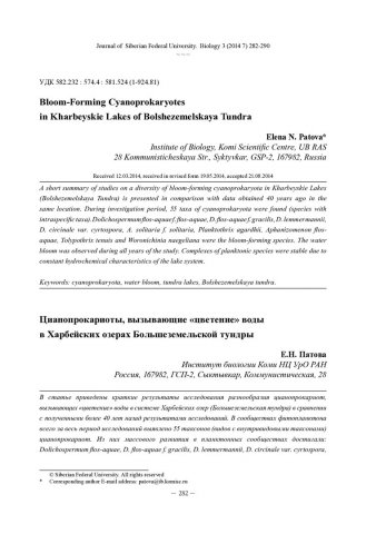 Библиографическое описание: Патова, Е. Н. Цианопрокариоты, вызывающие «цветение» воды в Харбейских озерах Большеземельской тундры = Bloom-Forming Cyanoprokaryotes in Kharbeyskie Lakes of Bolshezemelskaya Tundra / Е. Н. Патова. - Текст : непосредственный // Журнал Сибирского федерального университета. Биология. - 2014. - Т. 7, № 3. - С. 282-290 : табл. - Библиогр.: с. 288-290 (26 назв.). - ISSN 1997-1389.