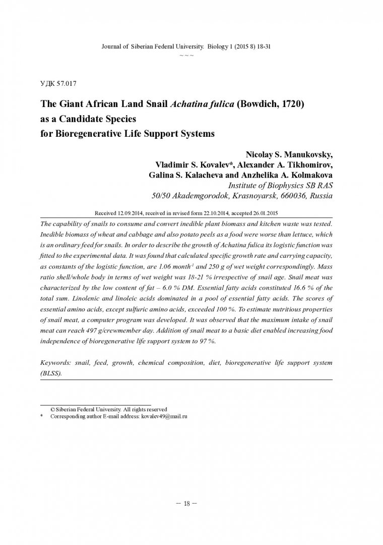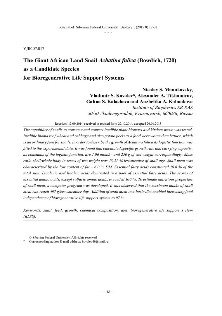 Библиографическое описание:The Giant African Land Snail Achatina fulica (Bowdich, 1720) as a Candidate Species for Bioregenerative Life Support Systems = Гигантская африканская наземная улитка Achatina fulica (Bowdich, 1720) как вид-кандидат для биорегенеративной системы жизнеобеспечения / N. S. Manukovsky [ et. al.]. - Текст : непосредственный // Журнал Сибирского федерального университета. Биология. - 2015. - Т. 8, № 1. - С. 18-31 : ил., табл. - Библиогр.: с. 30-31 (28 назв.). - ISSN 1997-1389.
