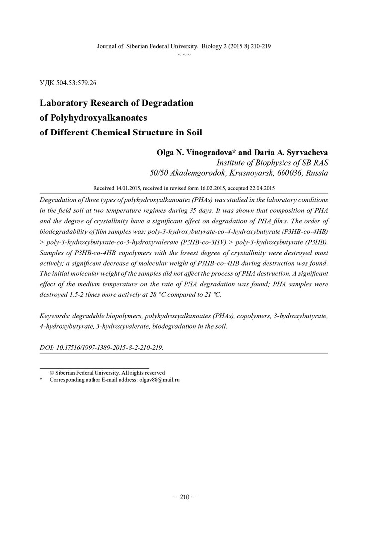 Библиографическое описание:Виноградова, О. Н. Лабораторные исследования деградации полигидроксиалканоатов различной химической структуры в почве = Laboratory Research of Degradation of Polyhydroxyalkanoates of Different Chemical Structure in Soil / О. Н. Виноградова, Д. А. Сырвачева. - Текст : непосредственный // Журнал Сибирского федерального университета. Биология. - 2015. - Т. 8, № 2. - С. 209-219 : ил., табл. - Библиогр.: с. 217-219 (31 назв.). - ISSN 1997-1389.