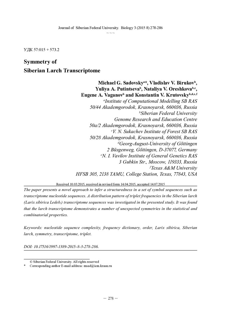 Библиографическое описание:Symmetry of Siberian Larch Transcriptome = Симметрия транскриптома сибирской лиственницы / M. G. Sadovsky [et. al.]. - Текст : непосредственный // Журнал Сибирского федерального университета. Биология. - 2015. - Т. 8, № 3. - С. 278-286 : ил. - Библиогр.: с. 285-286 (14 назв.). - ISSN 1997-1389.