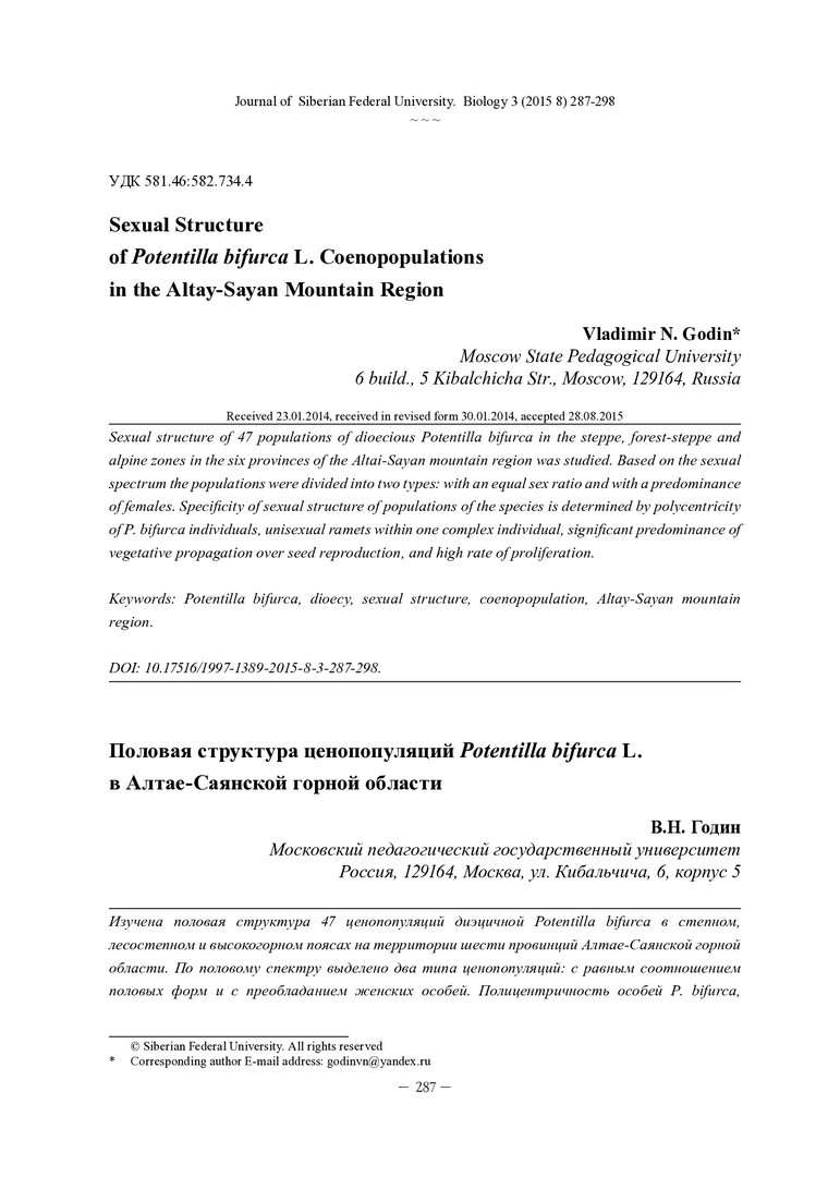 Библиографическое описание: Годин, В. Н. Половая структура ценопопуляций Potentilla bifurca L. в Алтае-Саянской горной области = Sexual Structure of Potentilla bifurca L. Coenopopulations in the Altay-Sayan Mountain Region / В. Н. Годин. - Текст : непосредственный // Журнал Сибирского федерального университета. Биология. - 2015. - Т. 8, № 3. - С. 287-298 : табл., ил. - Библиогр.: с. 297-298 (27 назв.). - ISSN 1997-1389.